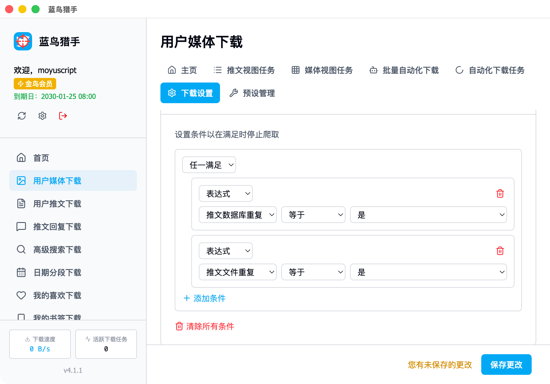 条件功能是蓝鸟猎手的一个特别强大灵活的功能,可以通过配置条件,决定推文、媒体是否下载,自动化任务是否停止,几乎所有功能都能够配置条件,本文章将教你如何配置条件。