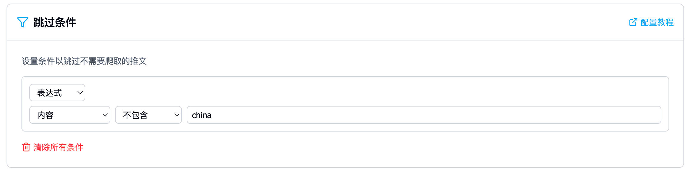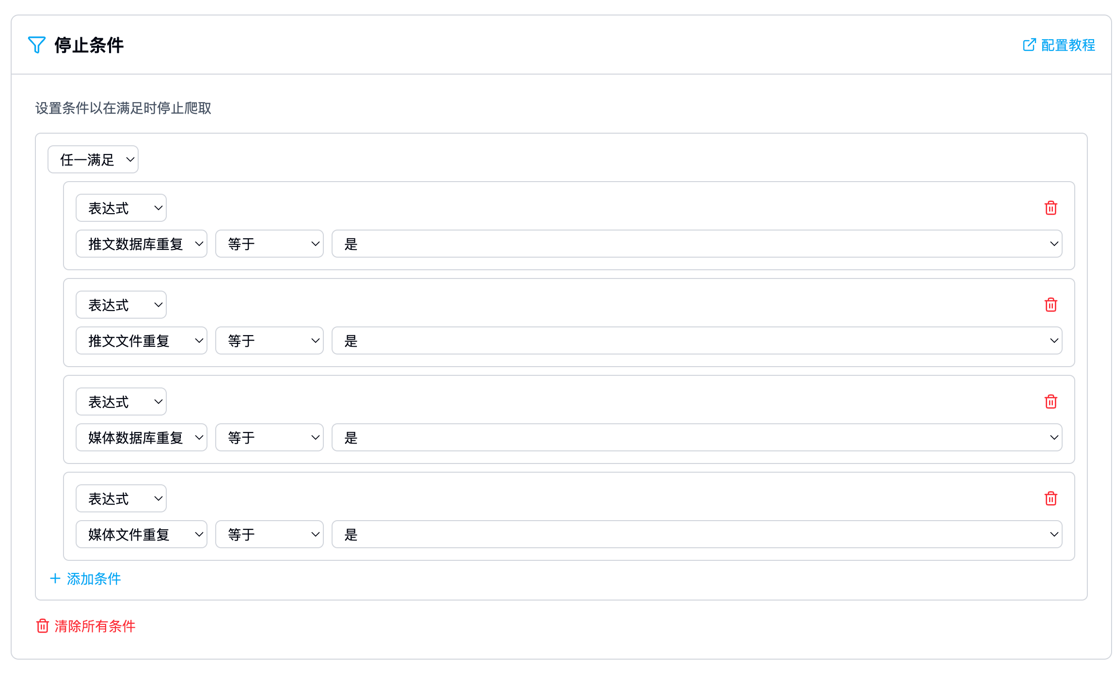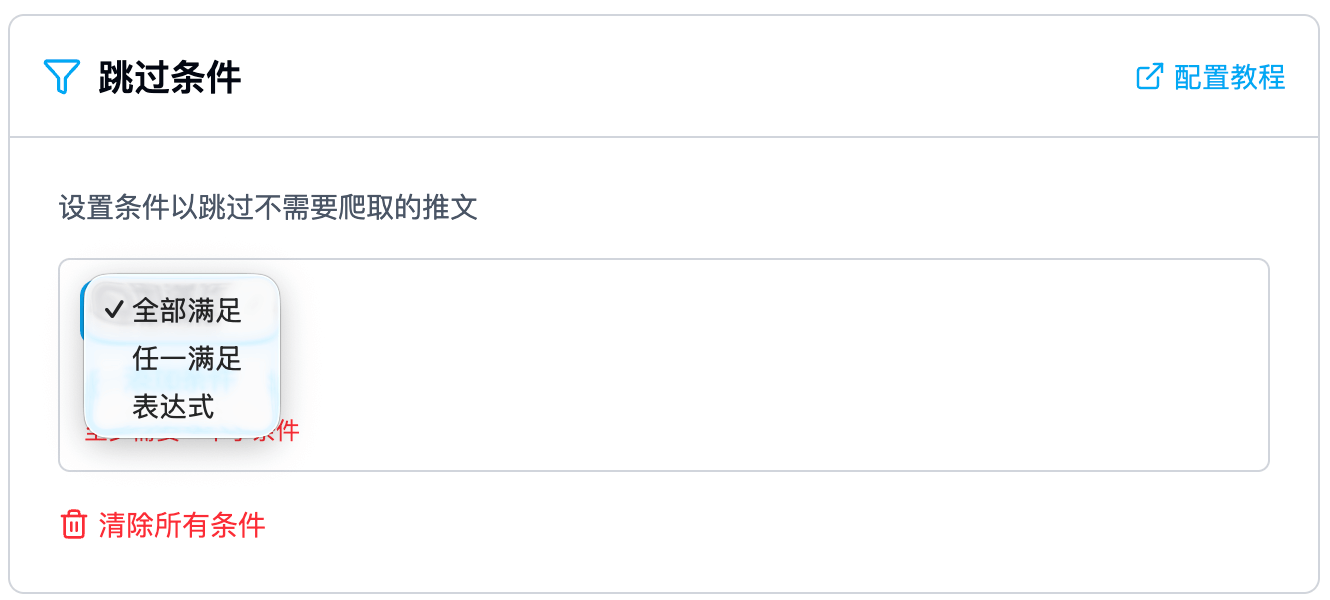 - 例子:设置“发布时间在2024年后”且“包含关键词‘发布会’” → 只有同时满足这两个条件的推文才会被处理。