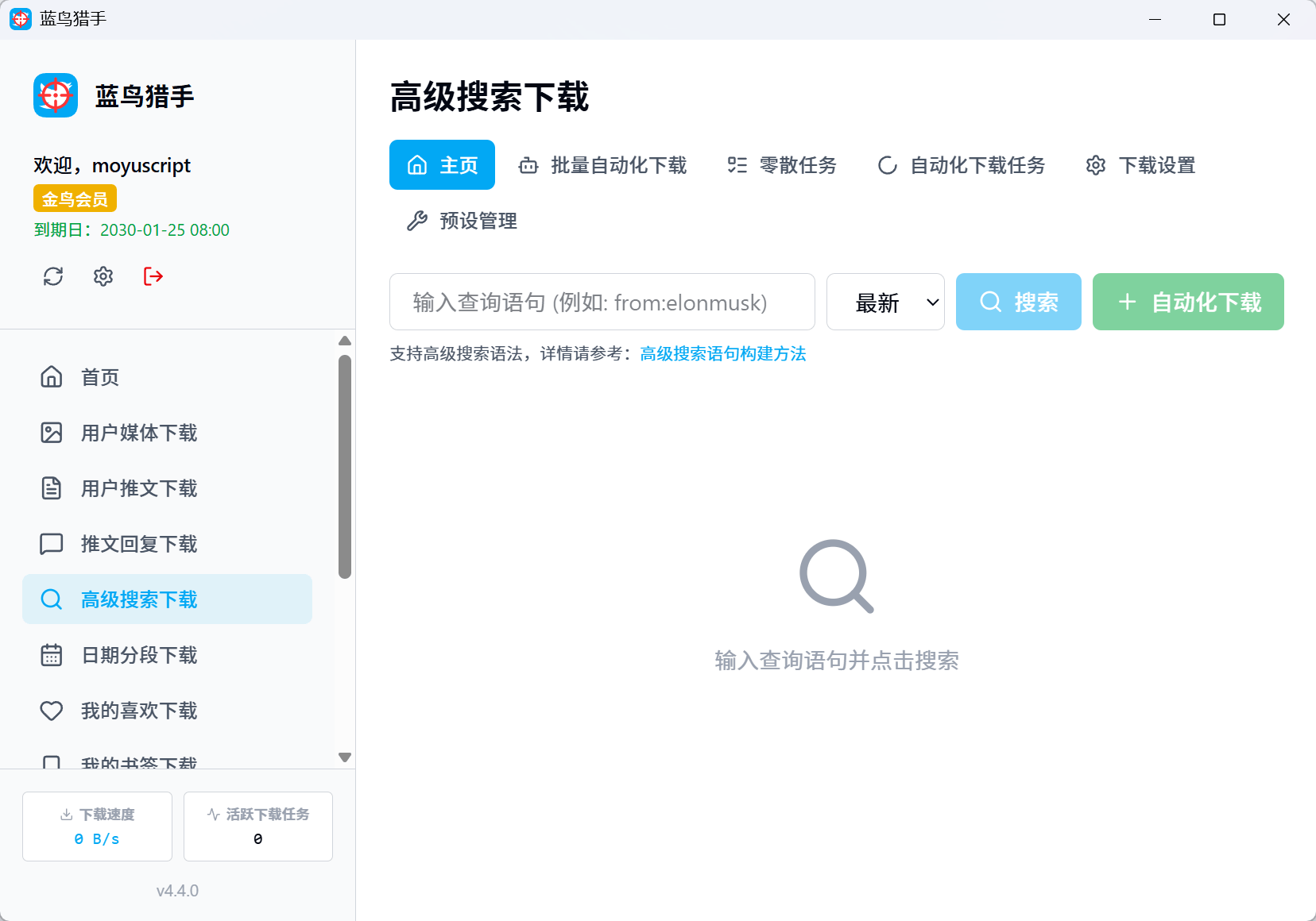 打开“蓝鸟猎手”,在左侧导航栏中找到并进入 “高级搜索下载” 页面。