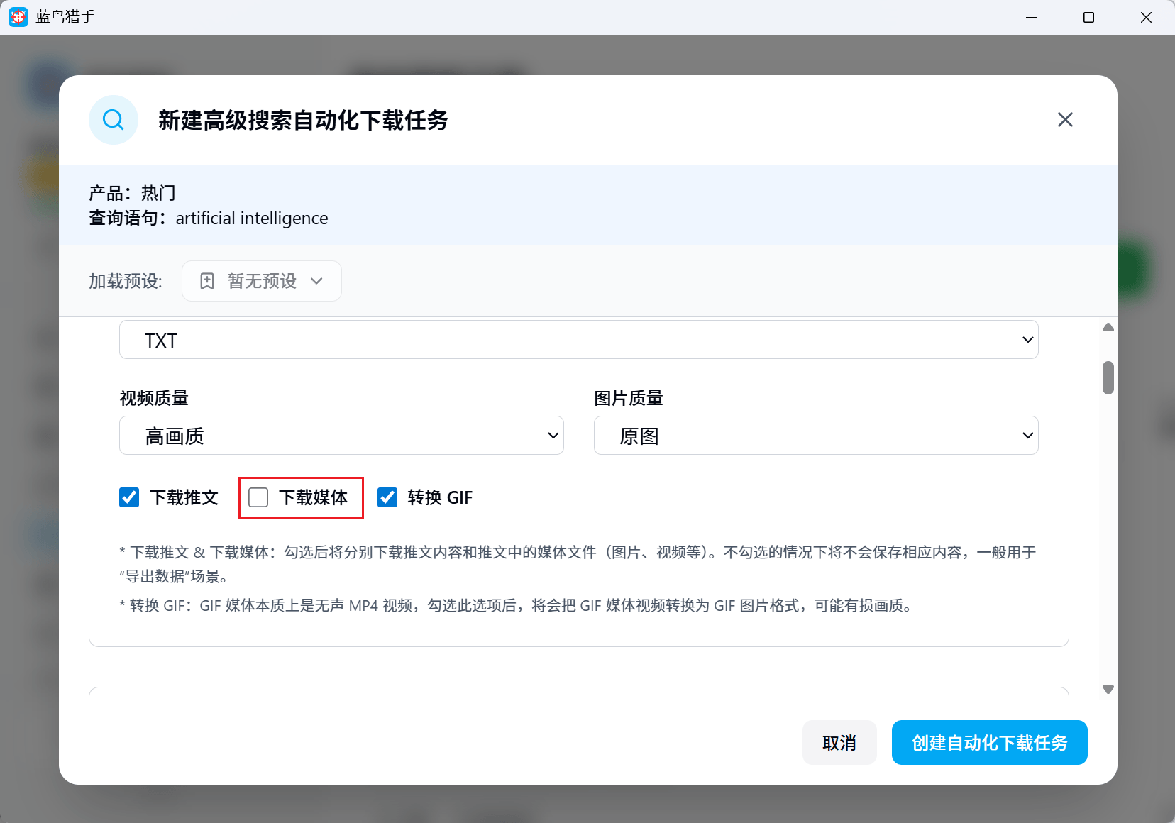 点击 “自动化下载” 按钮,将会弹出创建任务页面,你可以在这里根据你的需求调整下载设置,这里因为我们只需要采集“推文内容”,因此可以关闭“下载媒体”功能: