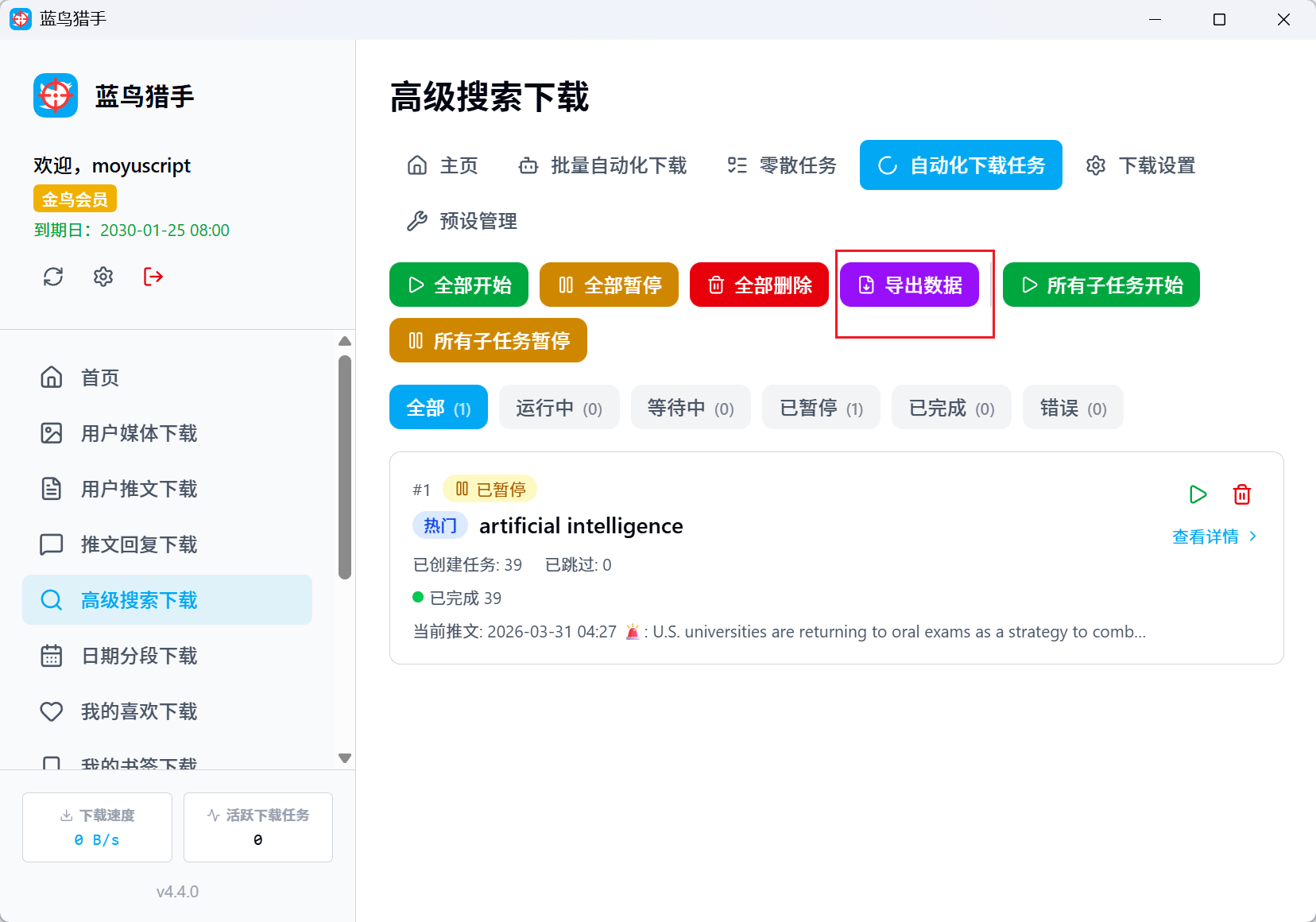 由于高级搜索下载搜出来的推文可能非常多,爬虫任务不一定会自动停止,你可以等待下载到一定数量推文后,手动暂停任务。