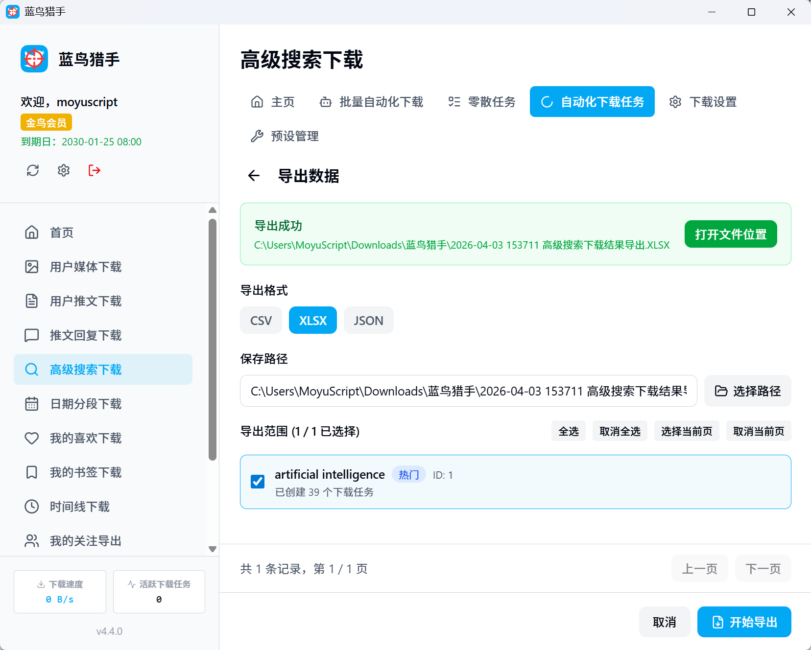 通过 “蓝鸟猎手” 的高级搜索下载功能,我仅用了不到10分钟就收集到了数千条与“artificial intelligence”相关的高质量推文,并顺利导出为Excel文件用于后续分析。整个过程无需写一行代码,极大地提高了论文数据收集的效率。