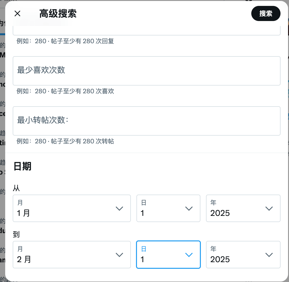 首先,使用浏览器打开:https://x.com/search-advanced。然后会直接弹出一个弹窗来输入高级搜索语句参数: