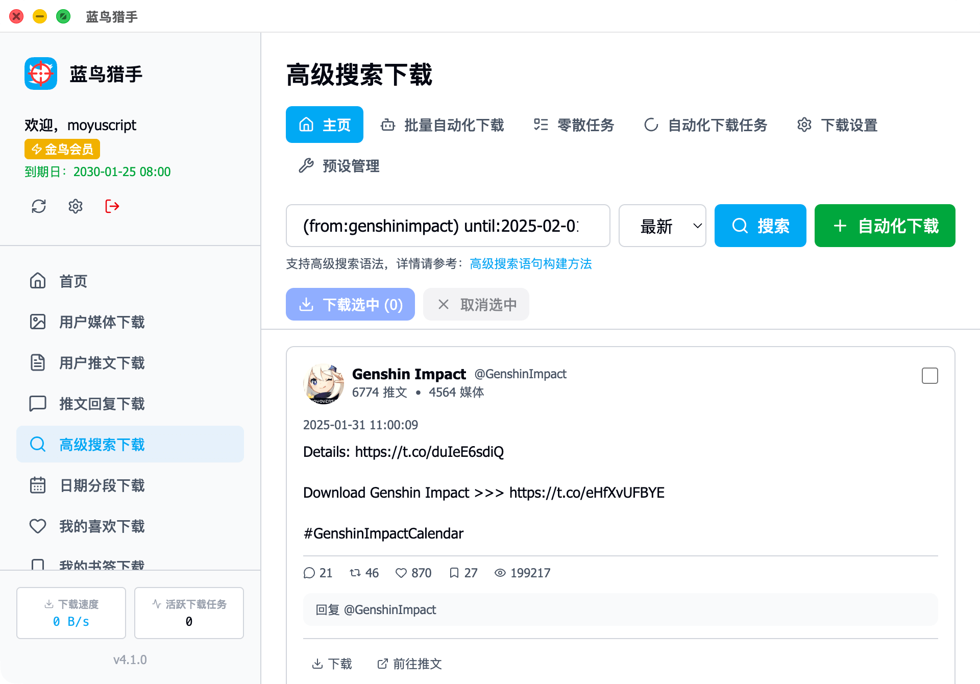 蓝鸟猎手支持使用高级搜索语句来搜索特定推文并自动化下载。高级搜索语句大概长下面这样:
