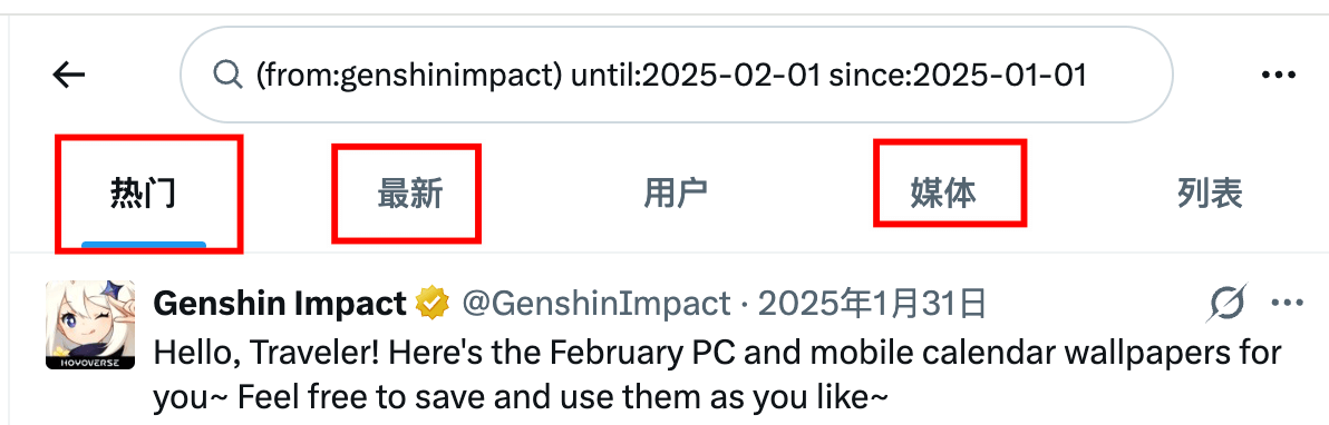 上面的语句意思是搜索账号 @GenshinImpact 在 2025 年 1 月 1 日到 2025 年 2 月 1 日之间发布的推文。
